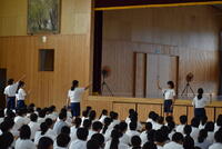 3年生代表から「学習時間を大切にしたい。思い出に残る学校生活を送りたい。自分から行動する。2年生代表から「目指している自分になる。大切なことを聞き逃さない。マイチャレなどの行事を頑張る。」1年生から「自分に自信をもって行動する。みんなとたくさん交流する。一生懸命に取り組むクラスにしたい。」と堂々と発表していました。2学期の活躍を期待したいです。