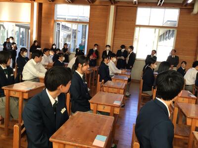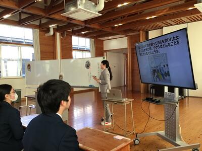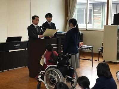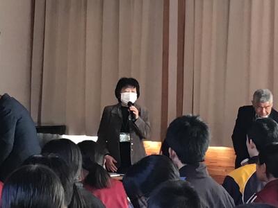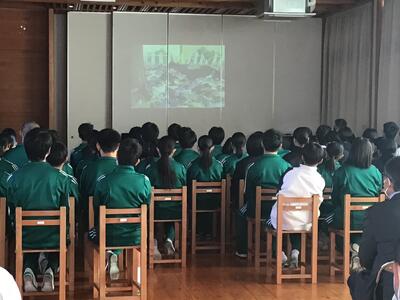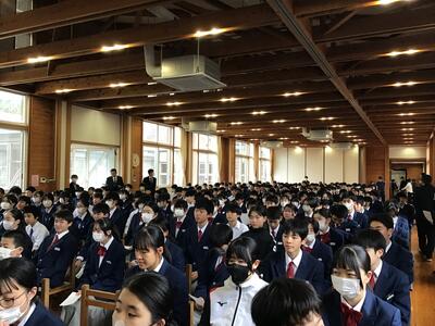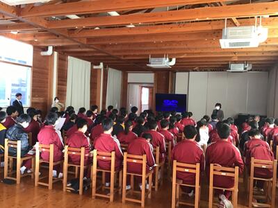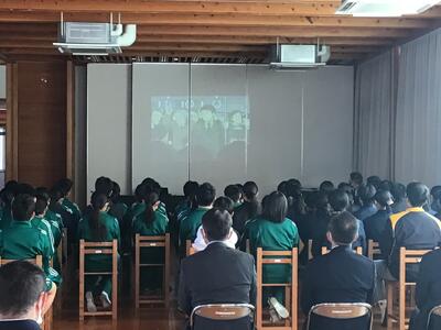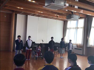 12月9日(火)に、人権擁護委員の方々をお迎えして、人権講話を行いました。高齢者、障害者、ジェンダー、国籍等、社会の中にある差別について考えるよい時間となりました。中学生向けに、アニメーションでの動画を視聴しました。「ほんの少しの勇気をだすことで誰かのためになる」ことを肌で感じることができ、視聴後は、生徒から、今後の生活の中で実践したいことなど、人に対してあたたかな意見を聞くことができました。