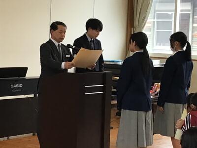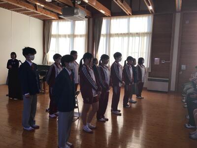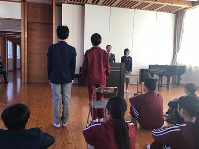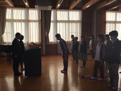 12月17日(水)の生徒会タイムでは、新部長、新生徒会役員の任命式を行いました。新たに任命された生徒たちは、堂々と大きな声で返事をし立派な態度で任命書を受け取っていました。これからの活躍が、とても楽しみです。校長先生からは、「大変なことや辛いこともあると思いますが、"One for all ,All for one 〜1人はみんなのために、みんなは1人のために〜"の精神で、頑張ってほしい」と激励がありました。