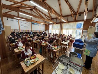 11/19(火)粟野地区学校給食共同調理場の場長、栄養教諭、栄養士の3名による学校訪問がありました。給食の様子全般を確認する事業です。給食配膳室からの運搬や各教室での配膳と食事の様子、さらには食後の後片付けまで、生徒たちを中心にその様子を見ていただきました。また、食事中にクイズも出題していただき、食材に対する子どもたちの意識を高めていただきました。
