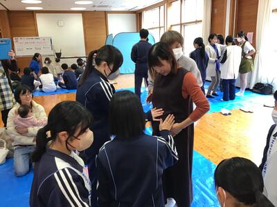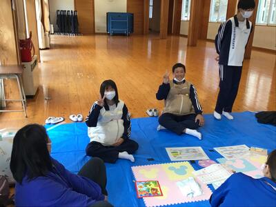 11/21(木)3年3組、4組の授業で赤ちゃんふれあい体験事業が実施されました。それぞれの学級でグループに分かれ、妊婦さん体験、赤ちゃんのお世話体験、感想発表を行いました。