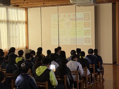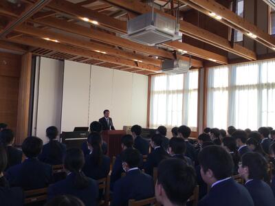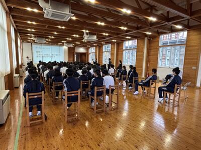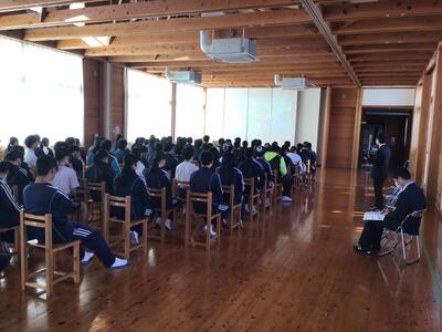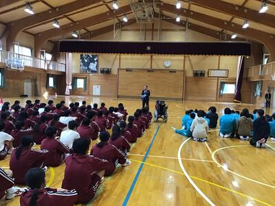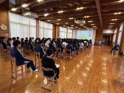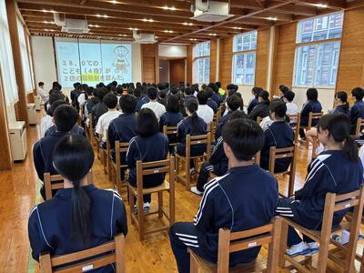 立志式に続いて特別講演会を開催しました。今回は、池田浩昭様をお招きし、「夢に向かって」をテーマにお話しいただきました。講演では、幼少時代に事故で片腕を失ったハンデキャップがあっても、学生時代は、剣道に取り組む環境の中で家族の支えや様々な方との出会いをきっかけに努力を重ね、中学校では個人戦、高校では個人戦と団体戦で県大会に優勝したそうです。就職後は、「障害があってもスポーツで活躍することができる。」という事を伝えるために、水泳にも挑戦して国内のパラリンピックで金メダルを獲得したエピソードなど様々なスポーツに挑戦しているというお話しいただき、生徒たちは真剣な表情で耳を傾けていました。