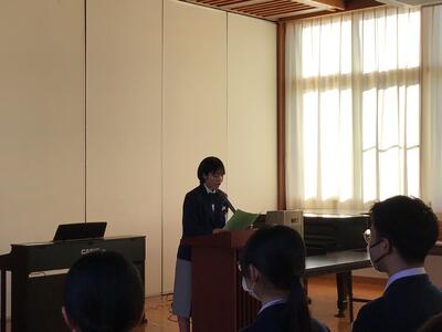 ・私たちはこれまで一人ひとりが意見を出し合い課題を見つけ、よりよい合唱にするために練習を頑張ってきました。中学校生活最後の文化祭なのでクラスのみんなと心を一つにして、思い出に残る合唱にしたいです。