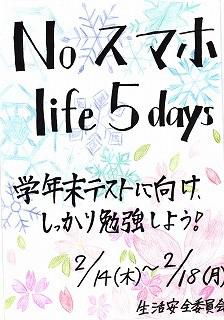 今学期もテスト休み期間中,できるだけメディアに触れないで家庭学習に集中することを目的に,クラスごとにポスターをつくり,ノースマホLife5Daysを啓発しています。1・2年生が対象です。メールでもお知らせしました。