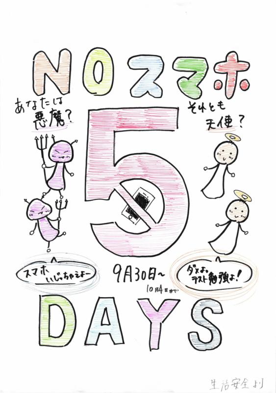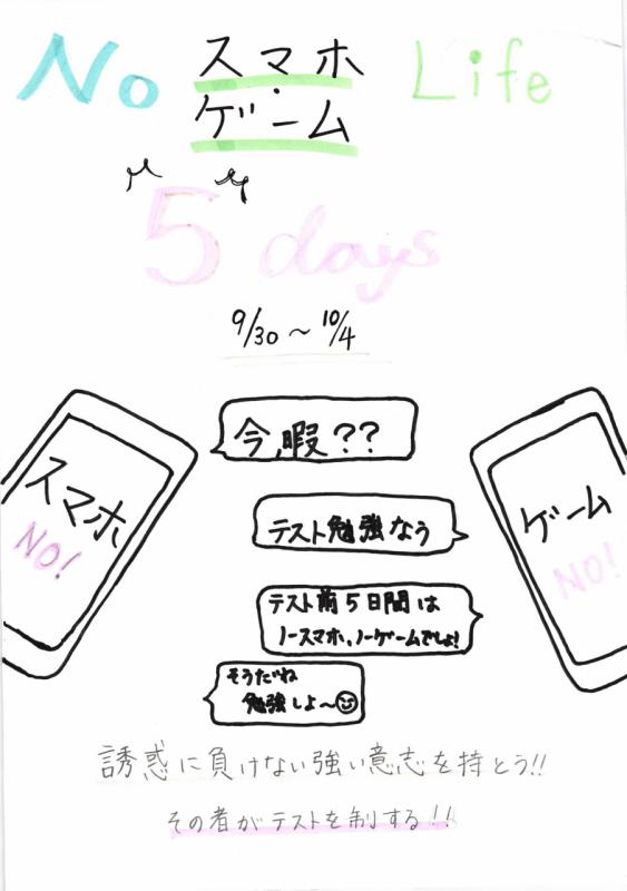 11月17日(金)~21日(火)の部活動のテスト休み期間の5日間を,できるだけメディアにふれることなく学習に集中するよう,生活安全委員会が中心となって,各クラスでポスターを作製して,ノースマホ・ノーゲームを呼びかけます。