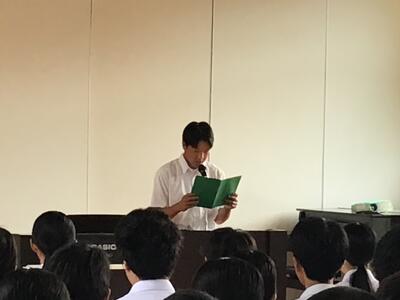 今年度から、鹿沼市は正式に2学期制となりました。先週の10日(金)は、前期の終業式を行いました。校長先生からは、「努力しても報われないこともある、しかし、努力しなければ報われることもない。だから、目標に向かってあきらめず続けてほしい。」とお話がありました。また、各学年の代表生徒も、発表の中で、前期を振り返って改善点を生かしていきたいと述べていました。