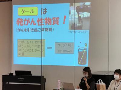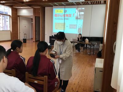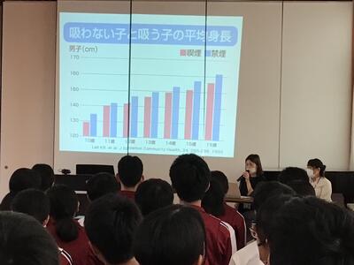 10月16日(木)に、市健康課の職員さんをお迎えして、喫煙防止教室を開催いたしました。タバコに含まるタールの原物を見せていただいたり、喫煙者の肺がどのようになっているかスライドで分かりやすく説明してくださいました。生徒たちは、驚きながら熱心に耳を傾けていました。