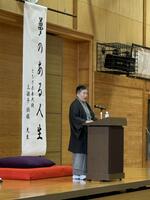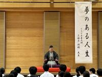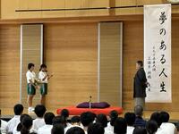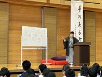 祖父母に連れられて落語を観に行った小学校時代、氣志團みたいな友達に囲まれてグレていった中学校時代、このままではだめだと感じ円歌師匠に手紙を20通ほど送った中学校3年生、円歌師匠に弟子入りした中学校卒業式三日後など、苦労話も面白く、おかしく聴かせていただきました。さすが噺家だなと感心いたしました。1年間の身習い、日当500円の前座、紋付き袴を着られるようになった二ツ目、そして、あし歌から三代目歌橘へと襲名し、師匠と呼ばれるようになった真打ちへと出生していく様子も楽しく聴かせていただきました。生徒には「人生は一度きり。一度きりの人生を楽しもう。」と呼びかけていただき講話を終えました。講話後は落語も披露していただき、とても幸せなひとときを過ごすことができました。ありがとうございました。