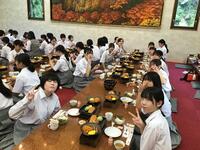 然林房で夜を過ごし、2日目の朝を迎えました。今日も朝日がまぶしいです。朝食の様子をアップします。全員元気です。