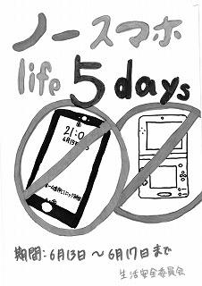 6月13日~17日の5日間を,生活安全委員会の呼びかけで「ノースマホLife5Days」というキャッチフレーズで,テスト休み期間中の5日間だけでもスマホ等を使用せずにテスト勉強に取り組むという挑戦をしています。各クラスでポスターを作り,実施に向けて取り組んでいます。