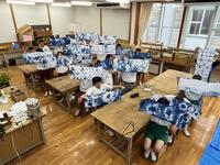 ゴムで縛ったり、板を挟んだり、ビー玉や塩ビ管を使ったりなど、それぞれが工夫をして取り組みました。染色液に3分ほど浸し、その後水洗いをしながら輪ゴムや板を外して、空気に触れさせると見事な藍色が現れました。色が浮き上がって模様が見えてくると子どもたちはとても喜んでいました。