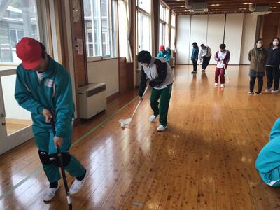 1/15(水)に続き、2/3(月)にわかくさ学級生徒と富屋特別支援学校鹿沼分校生徒とのユニホック交流がありました。今回は周回コースのドリブル練習、ドリブルで持ち込んでからのシュート練習、パスしたボールを受けてシュート練習など実践に近い練習をしました。