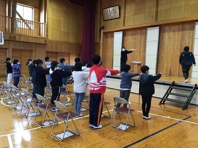 今回は、地震が発生し、その後の火災による避難を行いました。