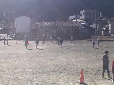 4チームに分かれて、ドリブルのリレーを行っていました。