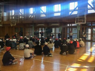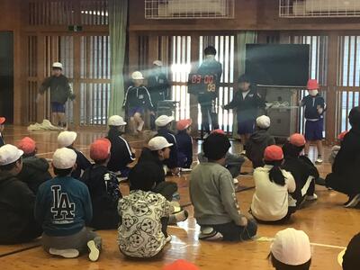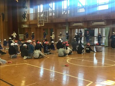 体育館に避難をしました。その後、消防署の方に水害を含めた災害への対応についてお話をしていただきました。