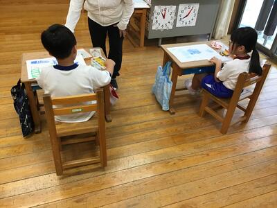 2年生と一緒の図工の授業です。色ぬりが終わった人は粘土や図工のプリントにチャレンジしていました。