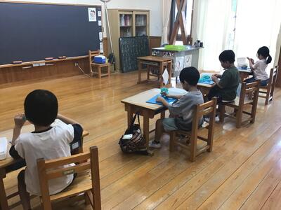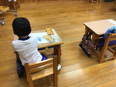 今日は工作です。色画用紙にのりをつけていました。この後、どんな工作が出来上がるのか、とても楽しみです。