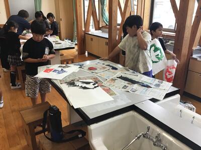 理科・図工室で制作の続きです。刷った紙の裏面に絵の具で色をつけていました。