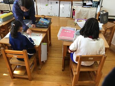 1年生は国語です。前回、絵を描いたハムスターやアリについて、見つけたことを文に書く課題に取り組んでいました。