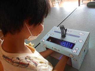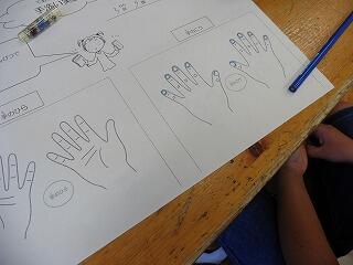 5年生も両手にブルーライトを当てて洗い残しを確認しました。