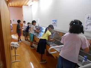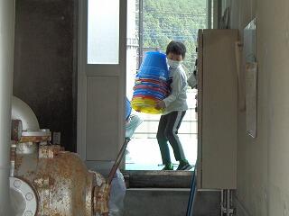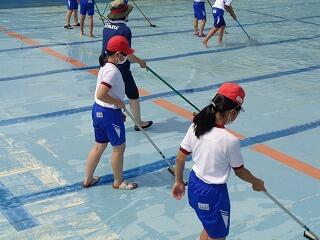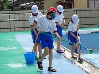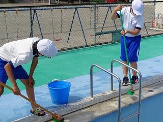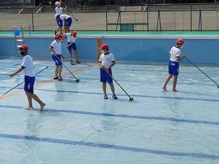 みんなで力を合わせ汚れていたプールを事前に清掃しました。