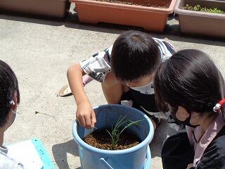 総合的な学習の時間の「森林学習」の一つとしてバケツ稲を育てています。