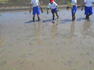 田んぼの先生 杢子さんから苗の植え方はもちろん、「植え方のきまり」を守ることがこれからの自分の生活にも役立つということを教えていただきました。