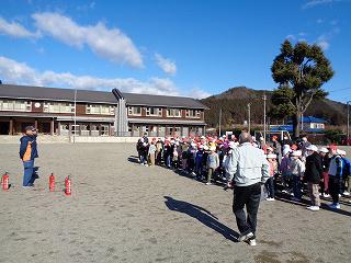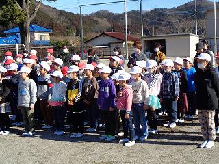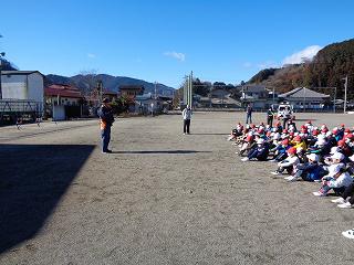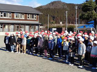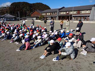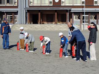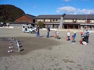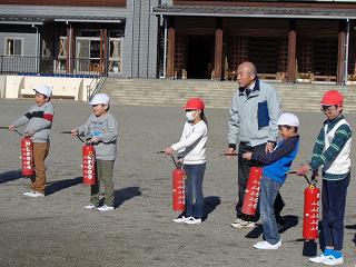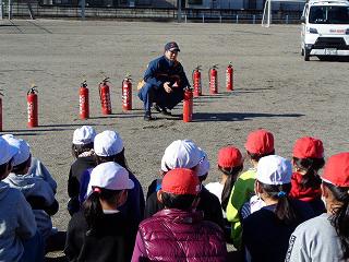 避難訓練を実施しました。地震、火災という状況を設定し訓練を行いました。全員が安全に確実に避難できました。全校生が避難するまで2分19秒、スムーズな避難でした。避難後は女性の先生方に消火器の操作をしていただきました。高学年児童は防災訓練等で消火器を使った子が多かったため、経験のない子に参加してもらいました。