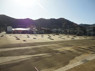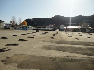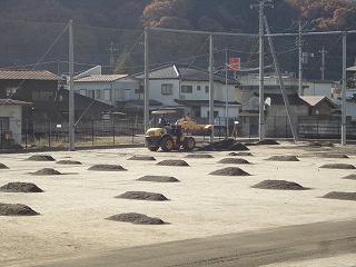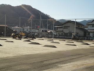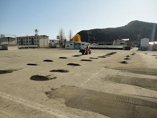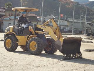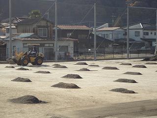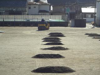 井戸産業さんによって校庭の整地作業が進められています。ポイントごとに砂を置き、ならしていきます。最後にローラーで固めてくださるそうです。早朝から作業していただきありがとうございます。月曜日からまた快適な環境で学習できます。