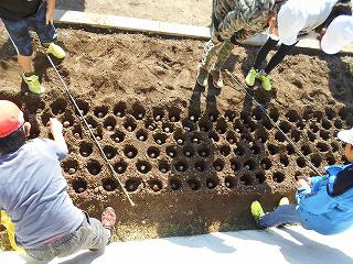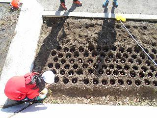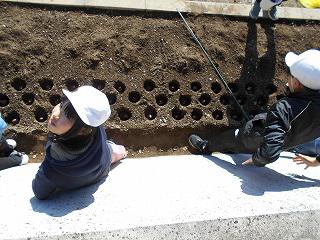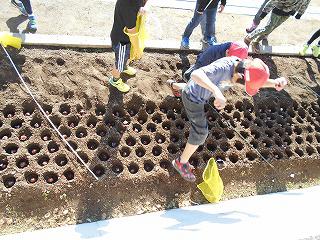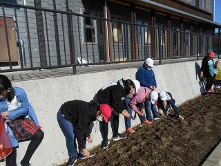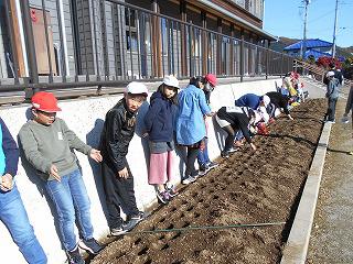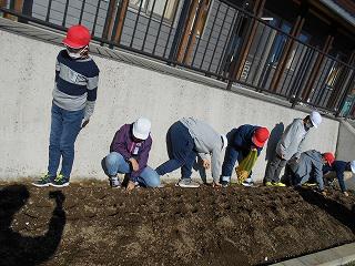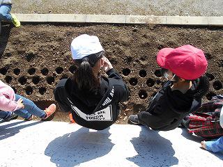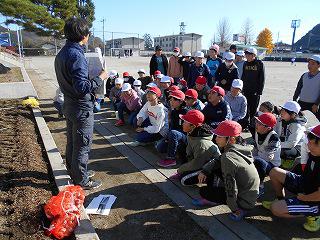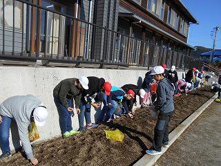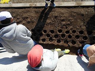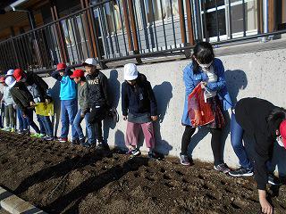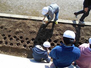 園芸委員会の先生と子どもたちが熱心に畑の整備をしてくれましたので、球根が楽に植えられます。球根の向きがありますのでそれを考えて植えるようにしています。