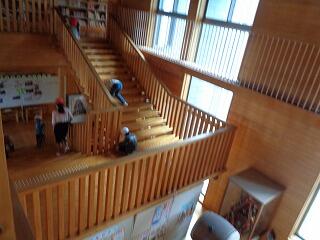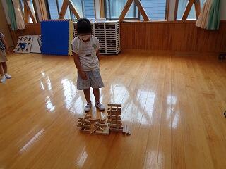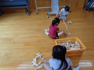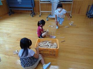 校舎建築の際の材料の木片を積み木にして遊んでいます。