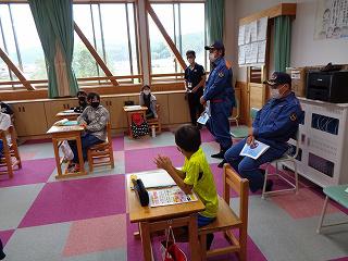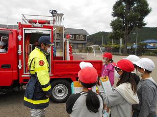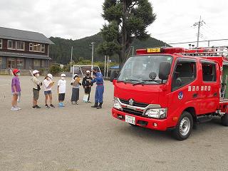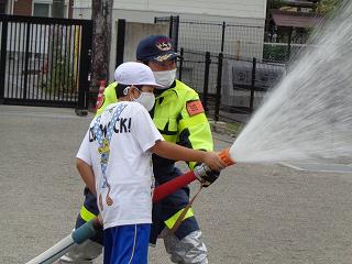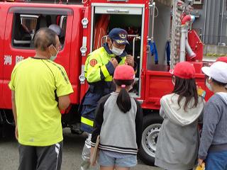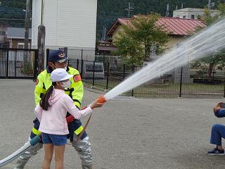 実際に消防車に乗せていただいたり、救命具や消防機器などの説明をしていただきました。最新の消防車を用意してくださり、子どもたちの興味がどんどん増していきました。放水体験ではその圧力や遠方まで届く水の様子にみんな感激していました。