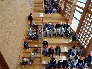 2年生の6年生へのビデオレターの様子です。体育館2階から撮影することで臨場感が満ちてきます。