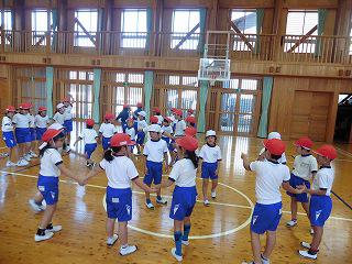 5年生のマット運動です。前転、逆立ち前転などに取り組みました。みんな進んで楽しく前転の技を磨こうとしています。上手にできると自然に歓声が起きます。