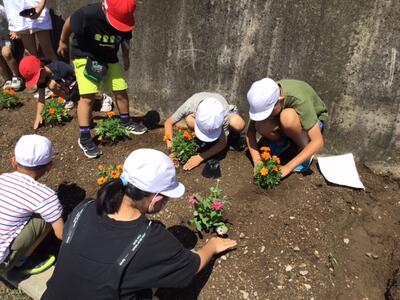 班ごとに花壇にジニアとマリーゴールドの苗を植えました。