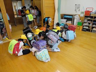 突然の降雨によって急遽室内で通学班会議を行いました。