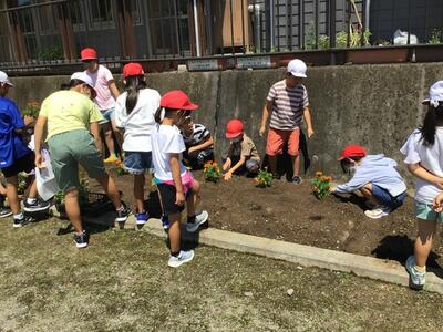 班ごとに花壇にジニアとマリーゴールドの苗を植えました。