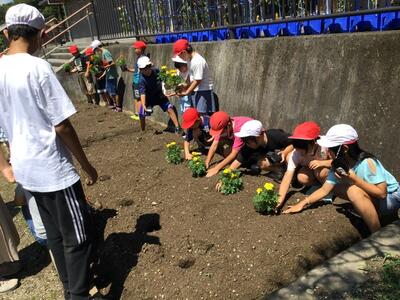班ごとに花壇にジニアとマリーゴールドの苗を植えました。