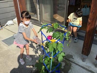 毎朝、園芸委員会の児童が、花壇やプランターの花の世話をしています。