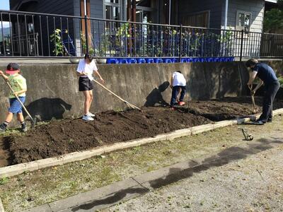 班ごとに花壇にジニアとマリーゴールドの苗を植えました。