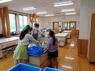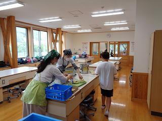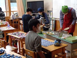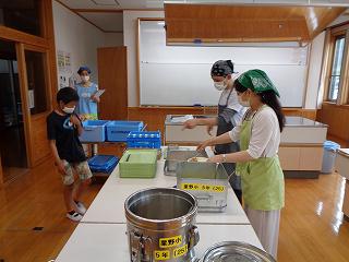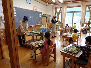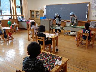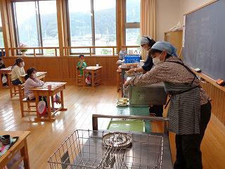 共同調理場の松島先生にも来ていただいています。5年生は家庭科室を使って配膳します。