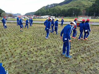 落ち穂拾いをしています。杢子先生によると稲穂一本に押すし一貫分のお米が付いていると言うことです。最後まで大切に収穫したいですね。