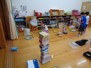 形について勉強しています。どんな形だと積み重ねることができるのか、ころがってしまうのか、たくさんの形に親しんでいます。