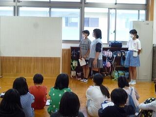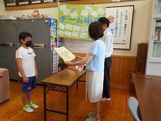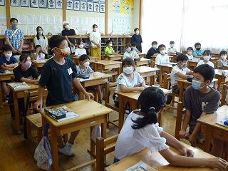 1年1組と3年1組、2組に入って児童と関わっています。さすが中学生!はきはきと児童に分かりやすいように言葉を選んで自己紹介をしてくれました。子どもたちは、すぐに中学生の周りを囲んで会話を弾ませたり、昼休みの共遊では、輪に入って一緒に遊んでくれたりしました。
