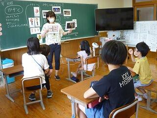 3年1組では、外国語活動を行っていました。ALTが漢字の画数の問題を出し、one、two、three・・・と英語で数え、画数を答えるクイズに盛り上がっていました。