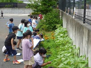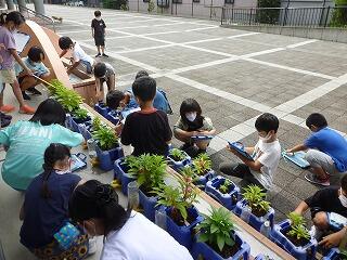 正門前の花壇では、地域の方が除草をしてくださっていました。1~3年生のプランターの花や作物もすくすくと育っています。水やりなどの世話をしっかりやっている証です。