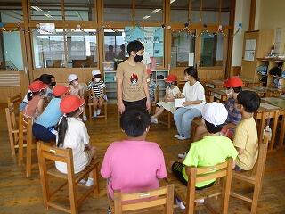 1組は、先日、外に出て虫を探し、写真を撮ってきました。それをオクリンクで送り、モニターに映して「虫はどこにいるでしょう?」と質問していました。画面を食い入るようによく見て虫を探す子供たち。虫が見つかると、手を挙げて元気よく発表していました。