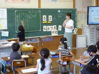 本校には、毎週金曜日に学力向上推進リーダーの先生が来てくださっています。今日は、2年生の算数の授業を進めてくださいました。「今までの学習をふりかえって計算しよう」をめあてに、繰り上がりのあるたし算、繰り下がりのあるひき算のやり方を説明する学習を行いました。