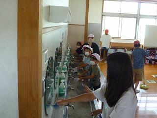 感染拡大防止のために、予定していたPTA奉仕作業は中止になりましたが、執行部の皆様と職員で、校庭側溝の砂はらいを行いました。