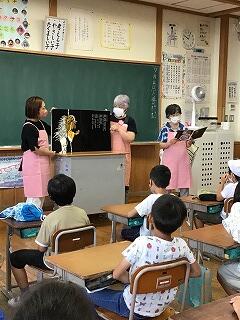 「なんでも食べよう!」をテーマに、栄養教諭から3つの栄養素についてのお話を聞き、バランスよく食べることの大切さを紙芝居などを通して学びました。お家の方と一緒に食べた給食の味は格別だったと思います。